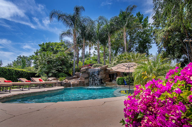 Welcome to one of the most beautiful and unique estates in all of Walnut Acres. This stunning modern Tuscan Estate is situated on almost 1 flat privately gated acre of one of the most desirable streets of this pristine community. This stunning oasis welcomes you with automatic security gates, video surveillance, large circular driveway, multiple garages, meticulously landscaped grounds with lush mature trees, water features and elegant exterior lighting. This exceptional property consists of 4800 sq. ft. 2 story main house & separate 1600 sq. ft. 2 + 2 guest house. Grand living spaces are found throughout, including a family room with coffered ceilings to match the outdoor living room and a custom bi-fold door which brings the outdoors in. Exquisite Chef’s kitchen with stainless appliances, huge island with extra sink and wine fridge. Formal dining room has a fireplace, custom bar with commercial ice maker & fridge, wine & cigar room & custom bifold doors that open to a serene and charming courtyard. The first level also features a guest suite, powder bath, laundry room and direct access to the garage through a mud room. The upstairs consists of 3 additional bedroom suites and teen center which can be an additional bedroom suite. The spacious master suite features wood beamed ceiling accents, sitting area, fireplace, large his and hers walk-in closet, & private dual balconies that overlook the colorful manicured grounds and amazing pool. The master bath has double vanities, bidet, large steam shower system & rainfall infinity edge tub. Feel the true resort experience in this entertainer’s dream backyard which features outdoor living room with fans/heaters, large BBQ, outdoor bar with icemaker & fridge, pizza oven, firepit, pool/spa, swim up bar & waterfall grotto with bar, fridge, icemaker, BBQ, lighted sport court, RV parking & Sonos sound system. The 2 + 2 guest house has a private entrance, family room w/fireplace, dining area, full kitchen with island, laundry room & private patio area.